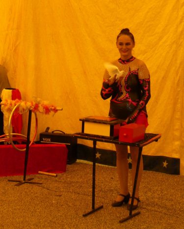 Après l’accueil de Madame Loyal, les spectateurs contemplaient un numéro de jonglage : balles, anneaux, massues ; David jongle avec tout, mais surtout avec une facilité déconcertante ! Puis, Monsieur Albaron faisait voyager le public sur la Cordillère des Andes avec Pitchou le lama. Place ensuite à Dave Shearer, équilibriste sur chaises, qui tentait l’équilibre en troisième hauteur ! Véritable point d’orgue du spectacle. Venait le tour de l’illusionniste Lætitia et ses colombes pour quelques tours de magie… Puis David repoussait encore les limites du raisonnable en mettant son sens de l’équilibre au service du Rolla-bolla. Enfin, le clown Aldo rentrait en piste pour le plus grand plaisir des petits… et des grands !