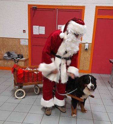 Ce divertissement était suivi d’un goûter fort apprécié ! Les friandises étaient apportées par le Père Noël avec un renne spécial transformé en bouvier bernois dît « Boubou ». Ce dernier tirait sa charrette remplie de chocolats pour le plus grand plaisir de tous les enfants enchantés de cette rencontre.