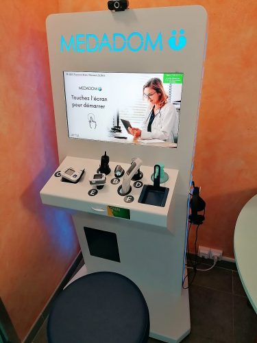 Il s’agit d’une borne équipée d’objets connectés (stéthoscope, otoscope, dermatoscope, oxymètre, tensiomètre, thermomètre) qui met en relation le patient avec un médecin généraliste, sans rendez-vous. L’accès au soin y est plus rapide, que ce soit pour un renouvellement d’ordonnance ou une prise en charge de pathologies aiguës ou bénignes.
