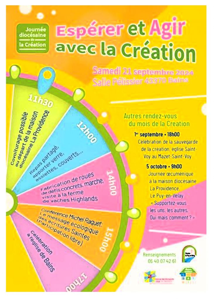 L’ensemble paroissiale du Velay volcanique vous propose de participer à la journée diocésaine de la Création le samedi 21 septembre à la Salle Pélissier à Bains avec le programme suivant :