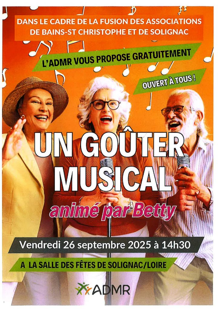 Dans le cadre de la fusion des associations de Bains, Saint Christophe sur Dolaizon et Solignac sur Loire, l’ADMR vous propose gratuitement (ouvert à tous !) un goûter musical animé par Betty le vendredi 26 septembre à 14h30 à la Salle des Fêtes de Solignac sur Loire.