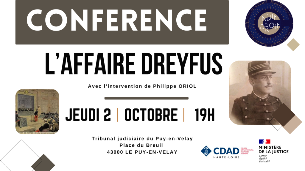 A l’occasion de la Nuit du droit 2025, une conférence sera organisée au Tribunal judiciaire du Puy-en-Velay, place du Breuil, le jeudi 2 octobre 2025 de 19h à 21h. Cette conférence portera sur : L’affaire Dreyfus.