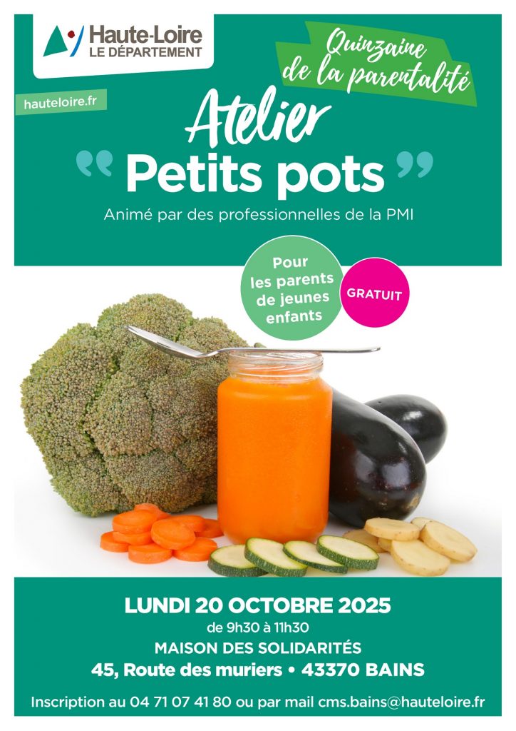 Dans le cadre de la « Quinzaine de la Parentalité », la PMI propose le lundi 20 octobre de 9h30 à 11h30, au Centre de Vie (route des Mûries) un atelier « Petit Pots » gratuit, animé par des professionnelles de la PMI, pour les parents de jeunes enfants.