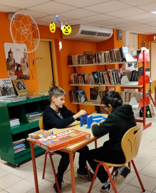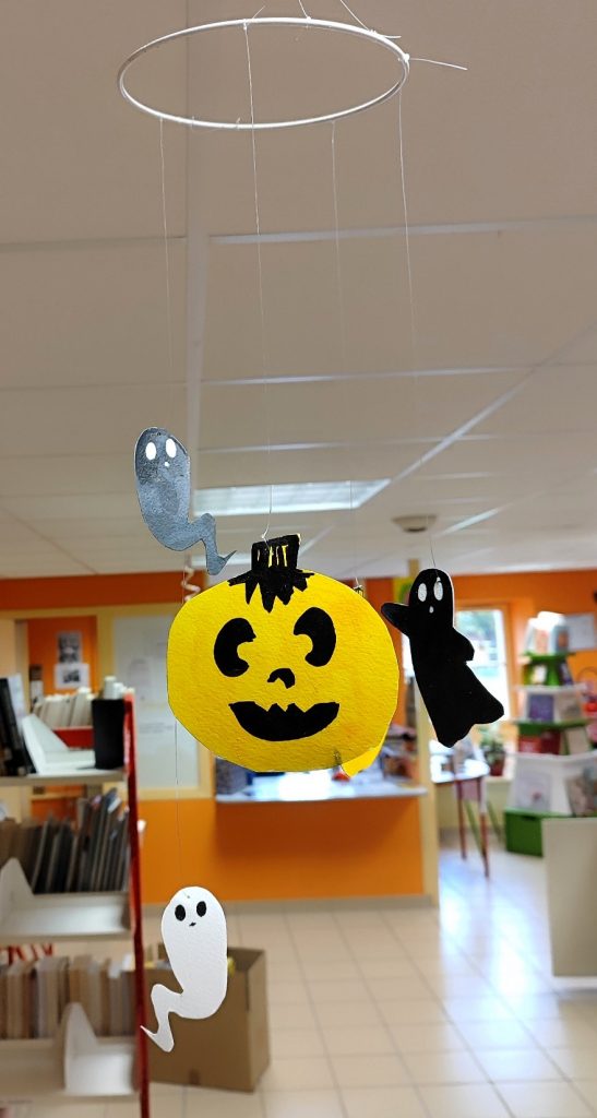 Pendant que les enfants venaient s’affronter pacifiquement autour de divers jeux, les bénévoles de la bibliothèque s’affairaient à parer celle-ci de petits fantômes et citrouilles édentées.