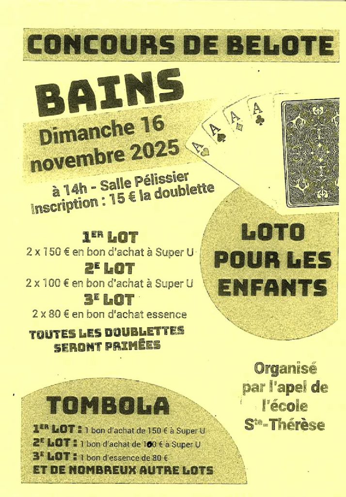 L’Association des parents d’élèves de l’Ecole Sainte-Thérèse organise son traditionnel concours de belote le dimanche 16 novembre à partir de 14 heures à la salle Pélissier. La doublette est fixée à 15€. 1er prix : 2 x 150€ en Bon d’Achat à Super U ; 2ème prix : 2 x 100€ en Bon d’Achat à Super U ; 3ème prix : 2 x 80€ en Bon d’essence. Toutes les doublettes seront primées.