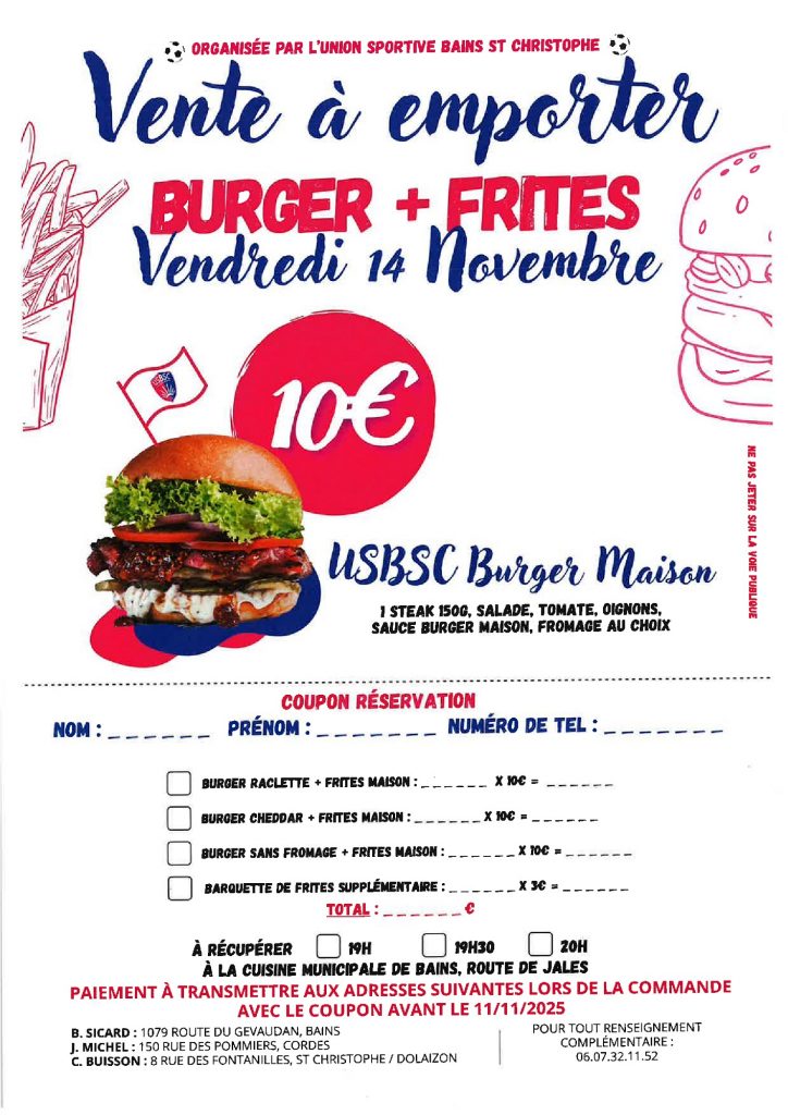 L’Union Sportive de Bains/Saint-Christophe vous propose une vente à emporter de Burger maison + frites le vendredi 14 novembre au tarif de 10€