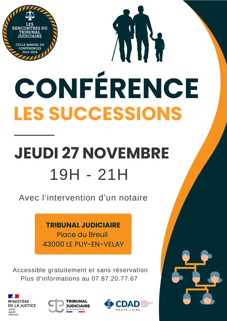 Le cycle de conférence : les Rencontres du Tribunal judiciaire se poursuit avec une nouvelle conférence qui aura lieu le jeudi 27 novembre 2025 de 19h à 21h et qui portera sur la thématique suivante : « Les successions »