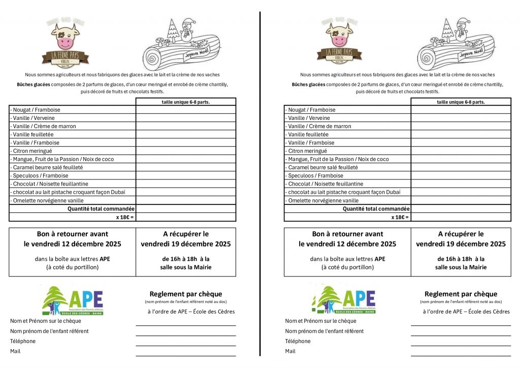 En collaboration avec « La ferme Pays » de Vergezac, l’Association de Parents d’Elèves de l’école publique des Cèdres vous propose une vente à emporter de bûches glacées.