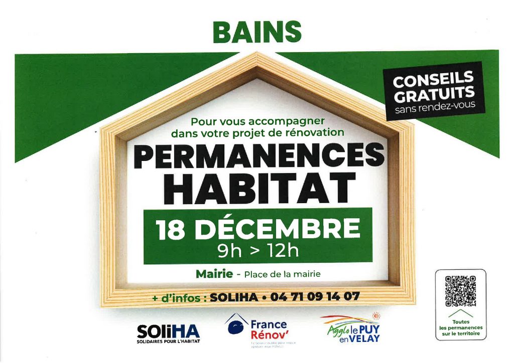 Les permanences Habitat de l’OPAH-Communautaire permettent de conseiller et guider les habitants de l’agglomération du Puy-en-Velay dans la rénovation de leur logement ; celle planifiée sur notre commune se déroulera le jeudi 18 décembre de 9h à 12h à la Salle sous la Mairie. Ces conseils sont gratuits.