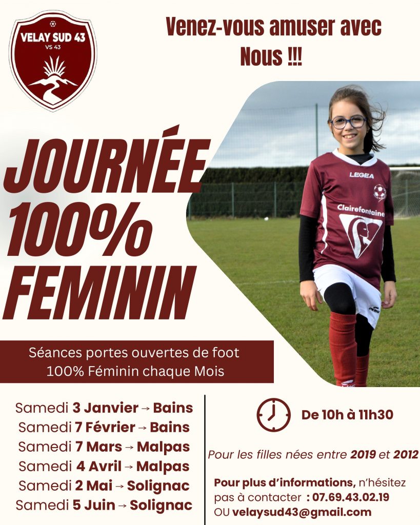 Pour les filles nées entre 2012 et 2019 qui souhaitent intégrer l’association sportive Velay Sud 43 et rejoindre les « grenats », des portes ouvertes aux séances d’entrainement 100% féminines se dérouleront chaque mois de 10h à 11h30 :
