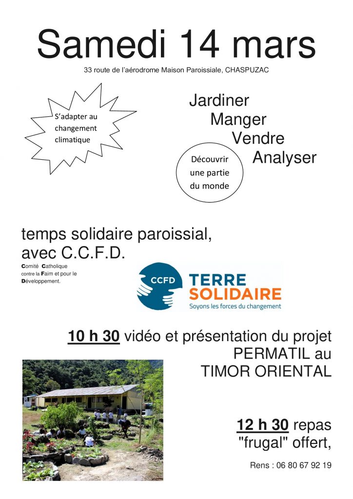 Après le visionnage d’une vidéo à 10h30 présentant le projet « Permatil (ONG) au Timor Oriental », un repas « frugal » sera offert à 12h30.