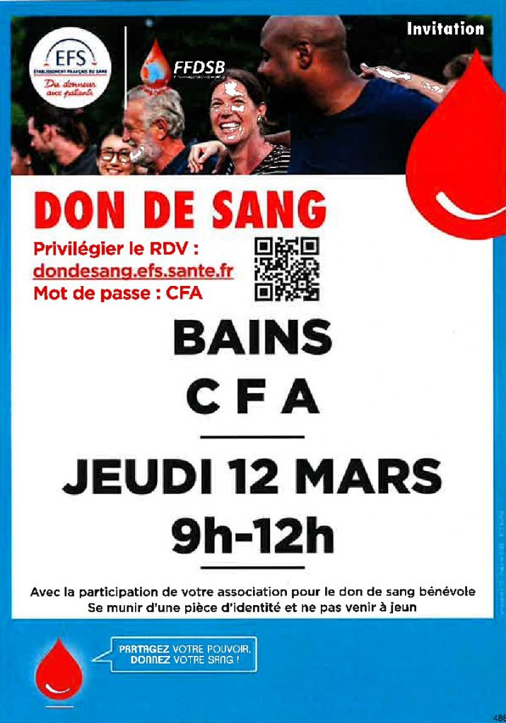 L’Amicale des Donneurs de Sang vous invite à la collecte de sang qui se déroulera dans les locaux du CFA le jeudi 12 mars de 9 h 00 à 12 h 00.