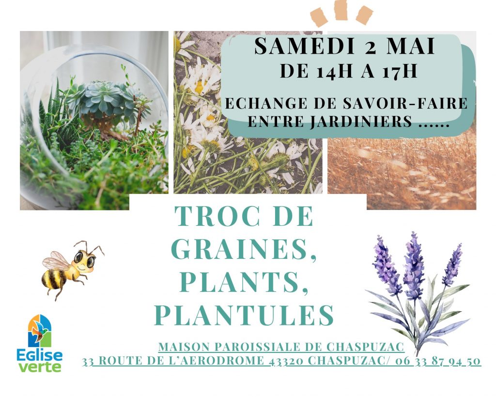 Avis aux jardiniers amateurs ou chevronnés… L’Ensemble Paroissial Saint Jean du Velay Volcanique vous propose un troc de graines, plants et plantules…, le samedi 02 mai de 14h à 17h à la maison paroissiale, route de l’aérodrome à Chaspuzac.