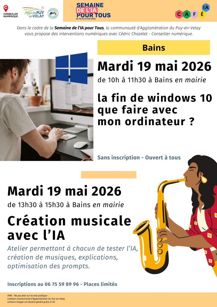 Dans le cadre de la semaine de l’IA pour tous, la Communauté d’Agglomération du Puy-en-Velay propose des interventions numériques animées par Cédric Chazelet, Conseiller Numérique.